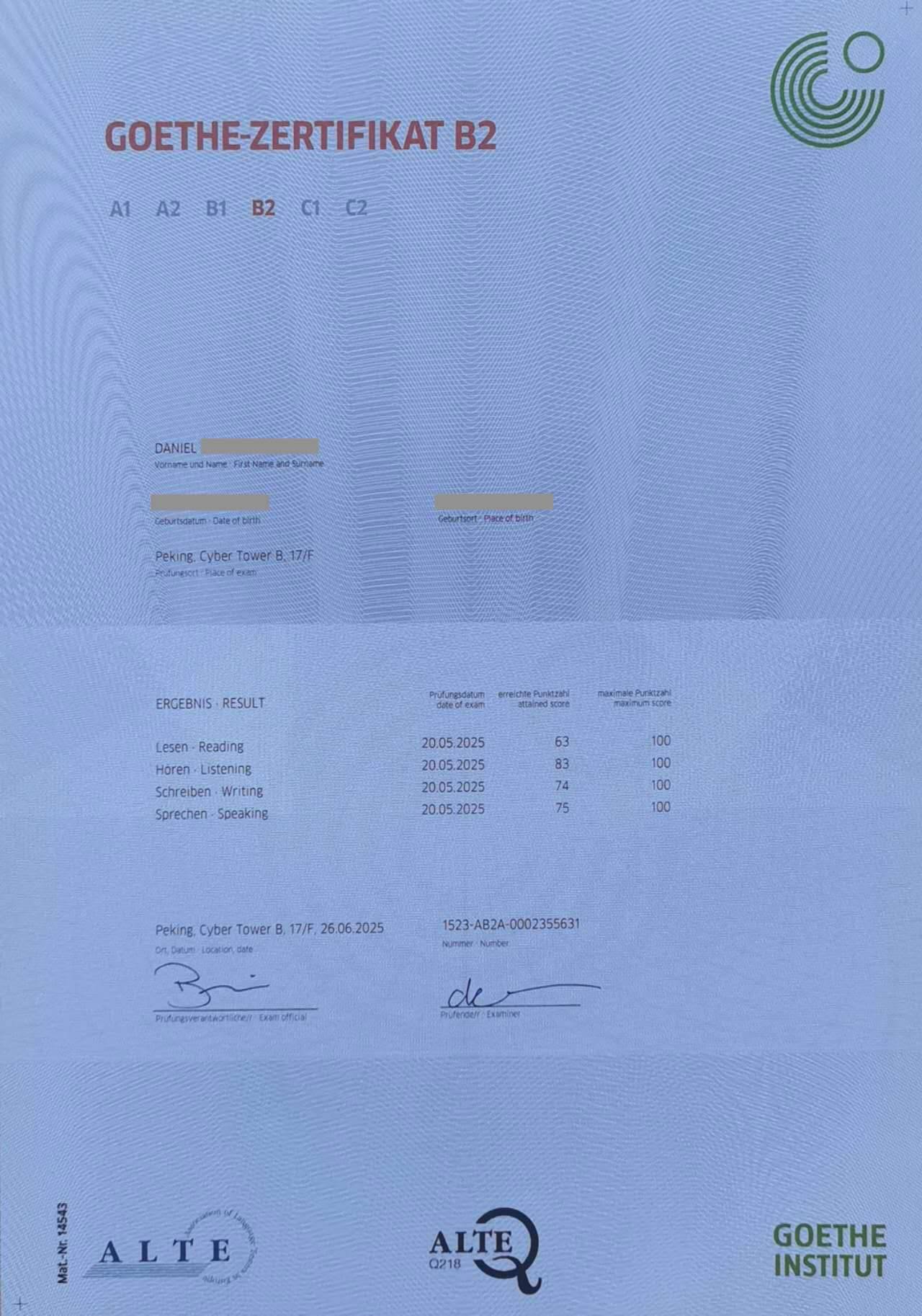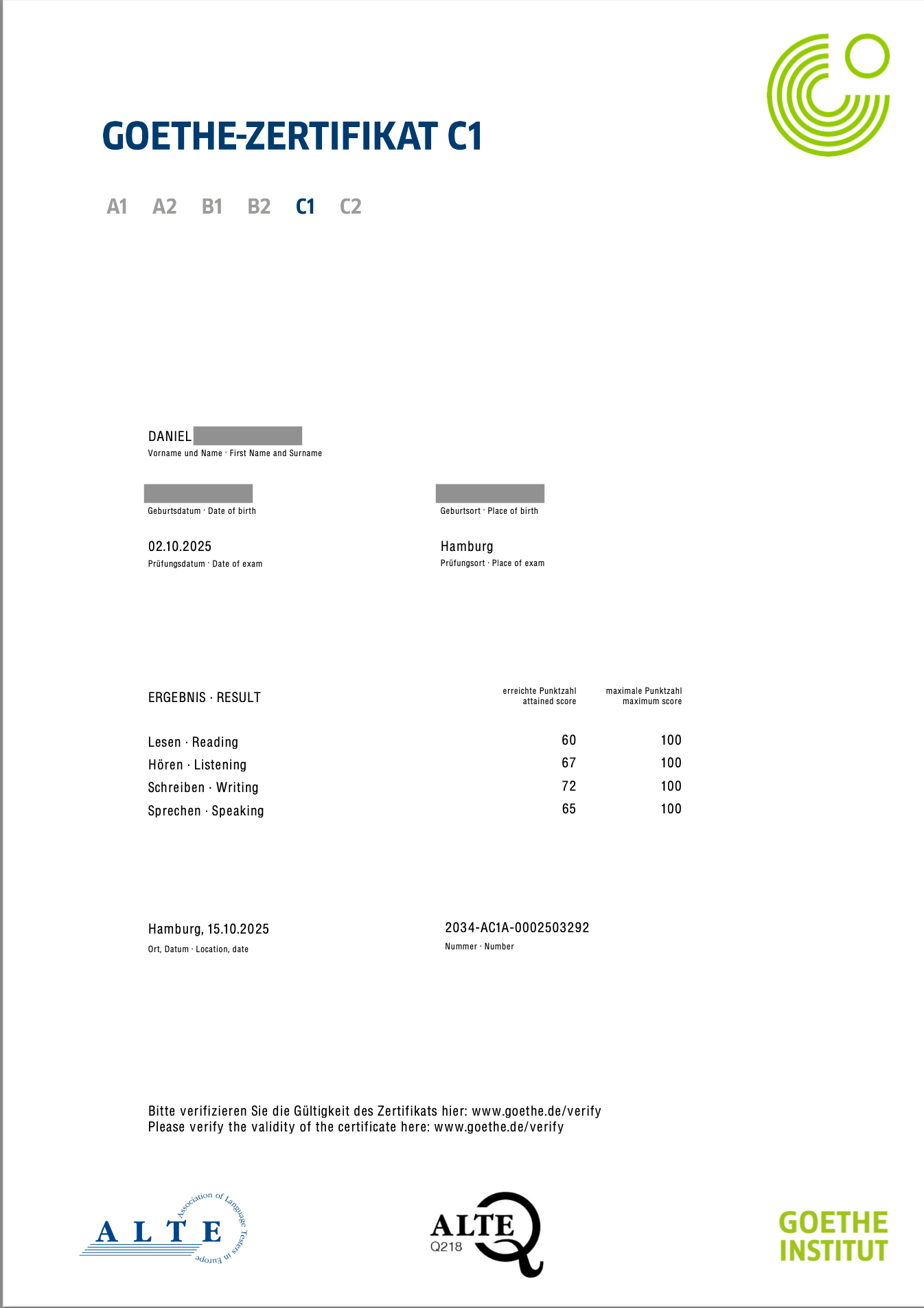 First, I’ve managed to pass the B2 checkpoint on my journey to C1. From my own perspective, it didn’t feel like a huge deal — especially since I barely scraped by with 63% (19/30) in Lesen. But later I found out I actually had the second-highest score, so maybe the paper was just hard?