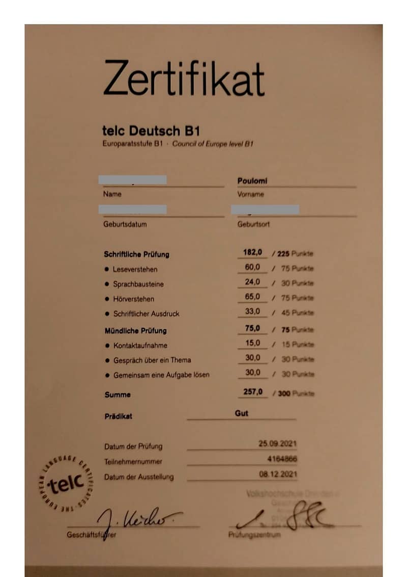 She was able to pass her official B1 Telc exam with an incredible 100% score in Speaking.
