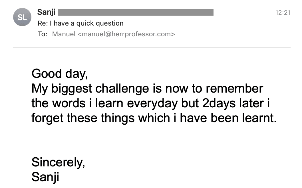 “My biggest challenge is now to remember the words I learn every day but 2 days later I forget these things which I have learnt.”